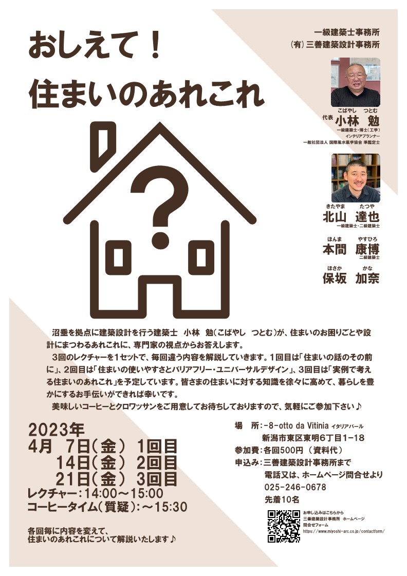 三善建築設計事務所では、「おしえて!住まいのあれこれ」と銘打って、住宅や建物を作るにあたって是非皆様に知っていただきたい事柄を、定期的にレクチャー会を企画しております!